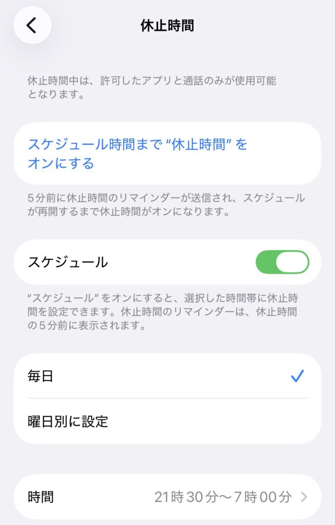 iPhoneの「スクリーンタイム」の場合、スマホを使える時間を設定するのではなく、スマホを使えなくする時間(休止時間)を設定します。
