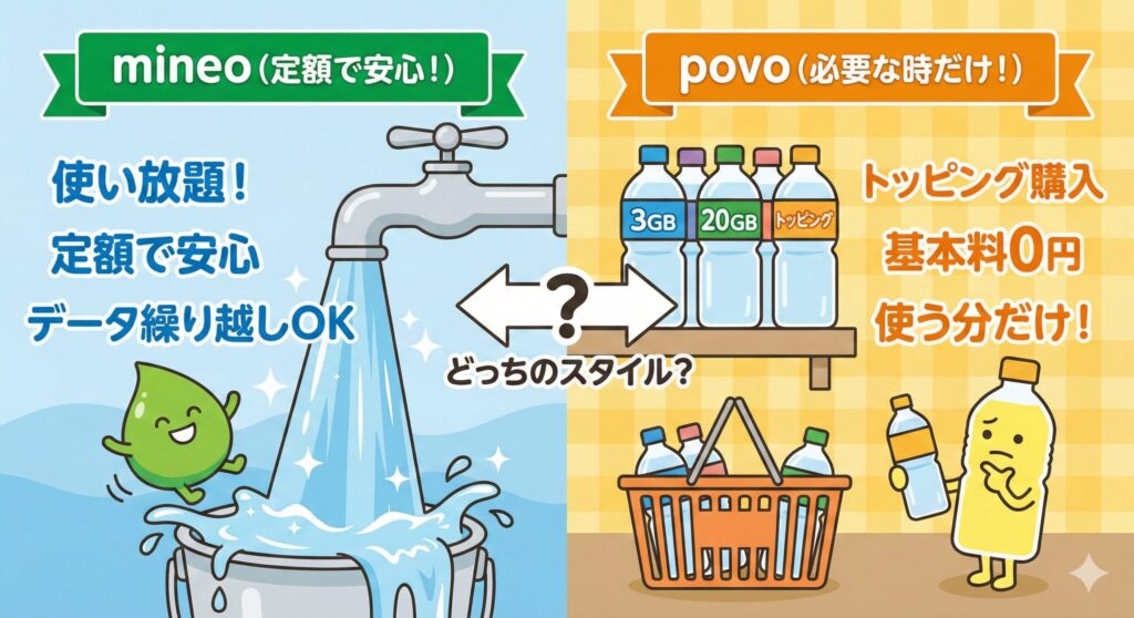 - mineoとpovo 2.0の、根本的なサービス内容の違い(水道 vs ペットボトル水)