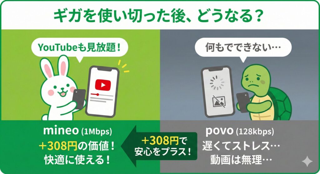 povoは3GB使い切ったら終わりですが、mineoなら使い切った後もYouTubeやSNSが見放題。